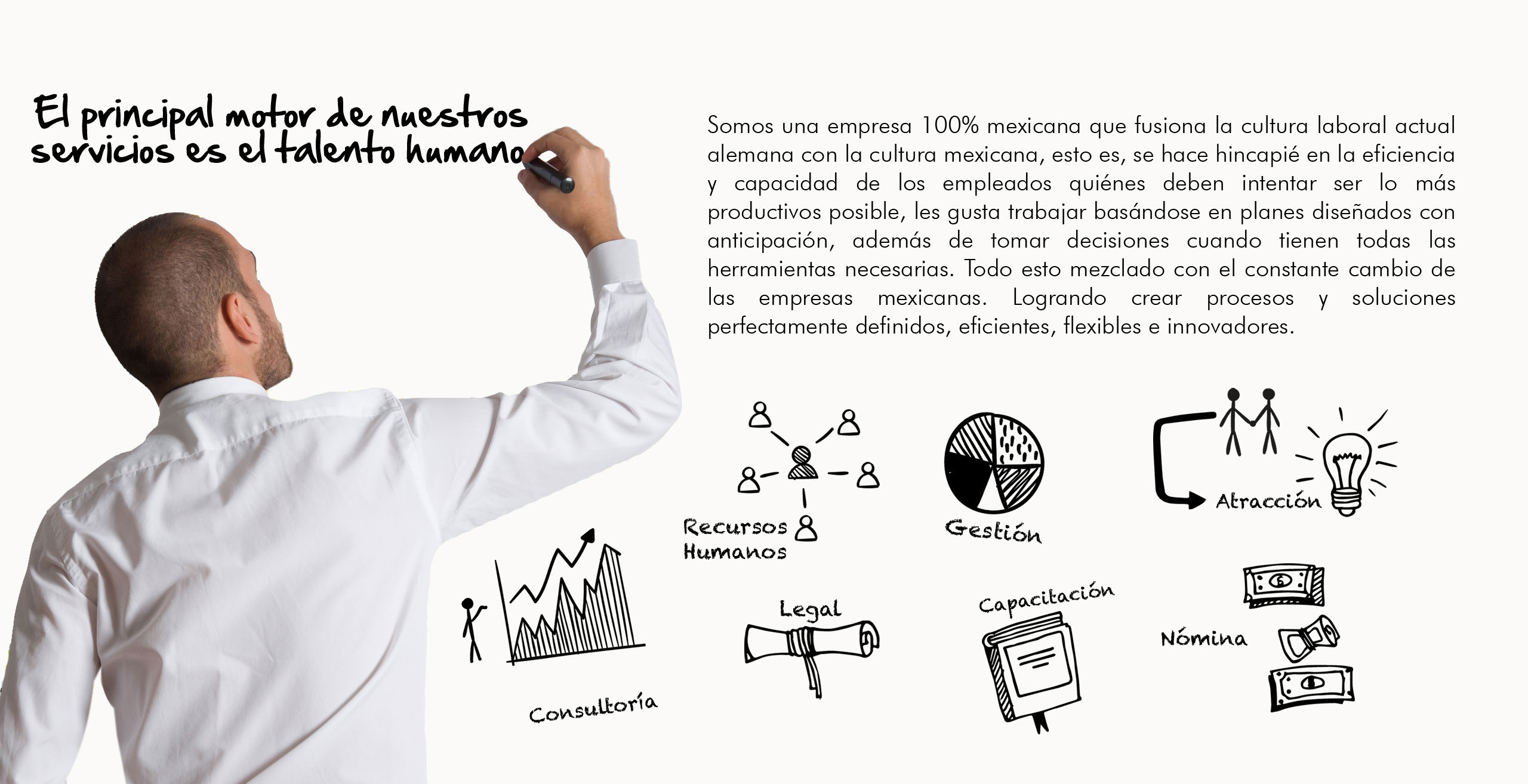 NUESTRA MISIÓN Generar estrategias efectivas para atraer, retener, administrar y desarrollar al talento que integra las diferentes compañías para las que prestamos nuestros servicios. Apoyando con esto al logro de los objetivos de negocio y con ello ser un aliado estratégico a largo plazo. NUESTRA VISIÓN Ser el mejor socio de negocio en soluciones especializadas de Capital Humano, caracterizándose por su Calidad, Servicio y Flexibilidad. Nuestros valores son: Innovación, Transparencia, Empatía y Congruencia.